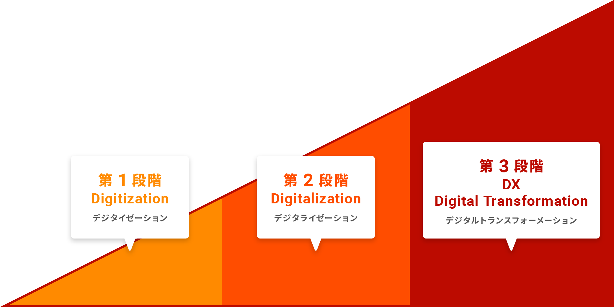 企業がデジタル化する際、そのプロセスは大きく分けて3段階あり、DXはその最終段階になります。