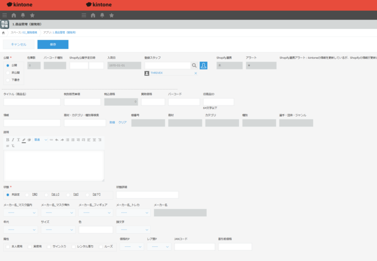 ShopifyはUIが固定されているので、どうしてもそれに従う必要があります。そうすると項目がたくさんあって、画面もスクロールしなくてはいけない。闘道館さんの場合、商品数が多いので、どうしても時間もかかってしまいます。なので、今回は入力フォームをkintoneで作りました。kintoneであれば項目の並べ方を自由に変えられます。以前の使い慣れたシステムと同じように組んで、1画面に集約するようにレイアウトして、スクロールすることなく1度に登録してアップできるようにしました。