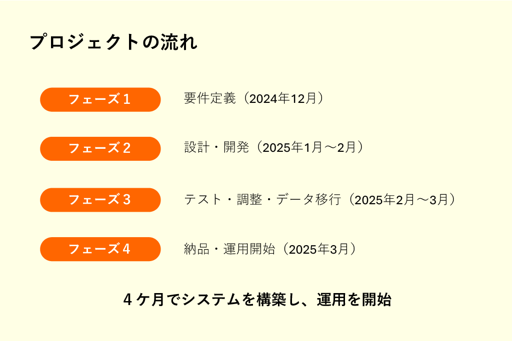 プロジェクトの開始が2024年の12月でサイトの運用開始予定が2025年の3月。約4ケ月という短期集中のスケジュールを4つのフェーズに分け、確実に進行できるように週1のミーティングを設定しました。泉館長、現場担当の仙石さん、システム担当の中村さんの皆さんが毎回積極的に参加して下さって、真摯にプロジェクトに向き合って頂けたのでkintoneの開発はスムーズに進行できたと思います。
